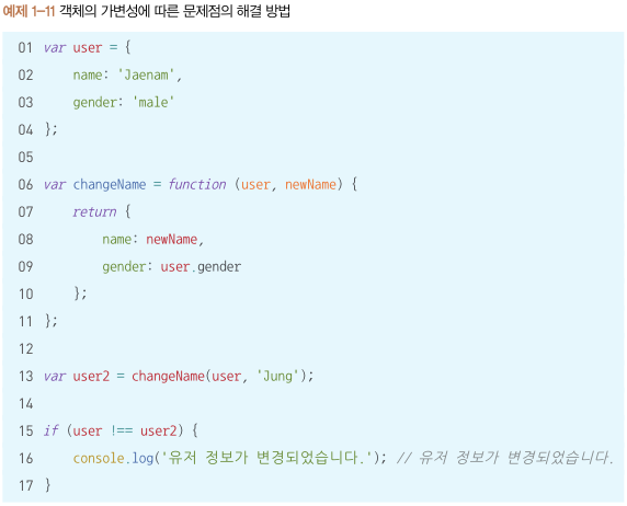 👉 이렇게 코드를 수정하여 협업하는 팀원들이 user 객체 내부를 변경할 때는 무조건 copyObject 함수를 사용하기로 하고 규칙을 지킨다는 전제 하에서는 원본 객체 user는 불변 객체가 된다.