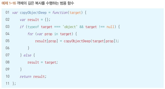 👉 위 예제의 copyObject 함수는 얕은 복사만 수행. 이 말은 중첩된 객체에서 참조형 데이터가 저장된 프로퍼티를 복사할 때 그 주솟값만 복사한다는 뜻. 원본과 사본 모두 동일한 참조형 데이터의 주소를 가리키므로 사본을 바꾸면 원본이, 원본을 바꾸면 사본이 바뀜.