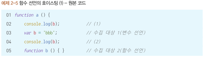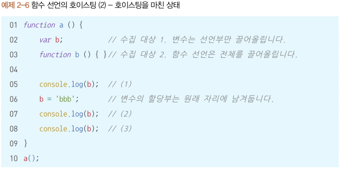 👉 변수는 선언부와 할당부를 나누어 선언부만 끌어올리는 반면 함수 선언은 함수 전체를 끌어올림.