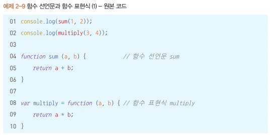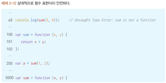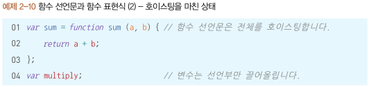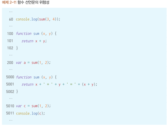 👉 예제 2-11과 2-12에서 함수가 엉뚱한 결괏값을 반환하는 문제도 함수 sum을 감싸는 별도의 함수를 선언하여 함수 sum을 지역변수로 만들면 쉽게 해결할 수 있는 문제이다.