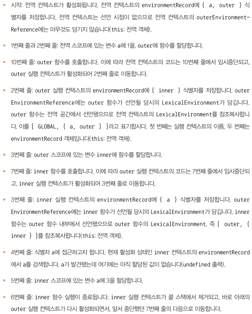 👉 스코프는 변수의 유효 범위. outerEnvironmentReference는 해당 함수가 선언된 위치의 LexicalEnvironment를 참조. 어떤 변수에 접근 시 현재 컨텍스트의 LexicalEnvironment를 탐색해서 발견되면 그 값을 반환하고, 없으면 outerEnvironmentReference에 담긴 LexicalEnvironment를 탐색. 전역 컨텍스트의 LexicalEnvironment에도 해당 변수가 없다면 undefined 반환.
