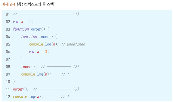 - 이를 콜 스택(call stack)에 쌓음. 실행 컨텍스트가 콜 스택의 맨 위에 쌓이는 순간이 현재 실행할 코드에 관여하게 되는 시점.