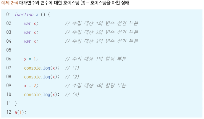 👉 environmentRecord는 식별자만 수집하고 식별자에 할당된 값은 수집하지 않음. 따라서 변수만 호이스팅하고 할당 과정은 원래 자리에 놔둠. 호이스팅을 마친 상태는 다음 예제와 같다.