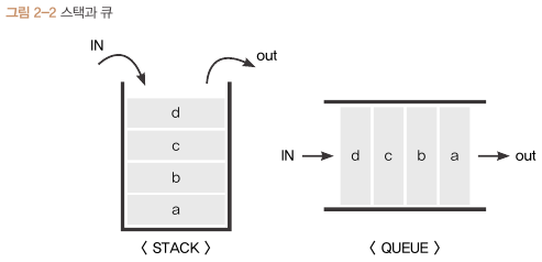 👉 출입구가 하나뿐인 우물 같은 데이터 구조. FILO(선입후출) or LIFO(후입선출)로 동작.