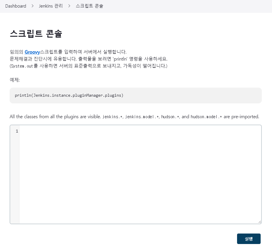 - Dashboard > Jenkins 관리 > Script Console로 이동