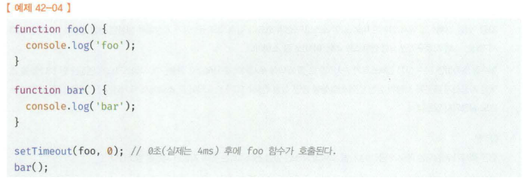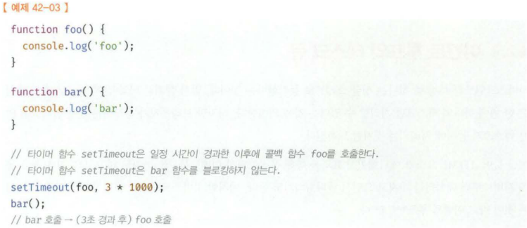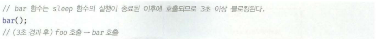 👉 위 예제에서 setTimeout 이후의 함수 bar는 블로킹되지 않고 실행됨. 이처럼 현재 실행 중인 함수가 종료되지 않아도 다음 태스크가 곧바로 실행되는 방식을 비동기(asynchronous) 처리라고 함.