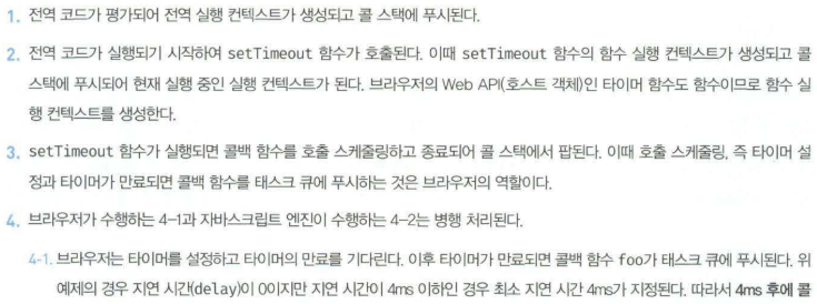 👉 앞선 예제에서 살펴봤듯 브라우저의 Web API인 setTimeout 함수가 호출되면 자바스크립트 엔진의 콜 스택에 푸시되어 실행됨. 하지만 setTimeout함수의 두 가지 기능인 타이머 설정과 타이머 만료 시 콜백 함수를 태스크 큐에 등록하는 처리는 브라우저가 담당함. 이처럼 자바스크림트 엔진과 브라우저가 협력하여 비동기 함수인 setTimeout을 실행하는 것이다.