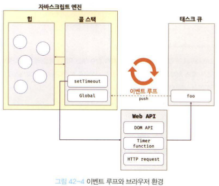 👉 예를 들어 setTimeout의 콜백 함수를 평가하고 실행하는 것은 자바스크립트 엔진이 담당하지만 타이머 설정과 콜백 함수의 등록은 브라우저 또는 Node.js가 담당. 이를 위해 브라우저 환경은 태스크 큐와 이벤트 루프를 제공함.