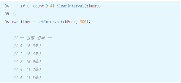 👉 위 예제에서 setInterval은 cbFunc라는 콜백 함수의 제어권을 가지고 0.3초마다 콜백 함수를 실행한다. 이처럼 콜백 함수의 제어권을 넘겨받은 함수는 콜백 함수 호출 시점에 대한 제어권을 가진다.