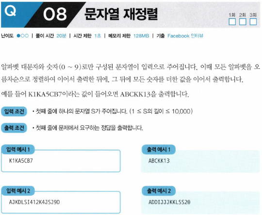 입력된 문자열을 반복문으로 탐색하면서 숫자라면 모두 더하고, 문자열이라면 따로 리스트에 담아둔다. 이후 문자가 담긴 리스트를 오름차순으로 정렬하고 숫자가 존재한다면 숫자를 모두 더한 값을 리스트의 맨 끝에 넣고 리스트를 문자열로 반환하면 된다.
