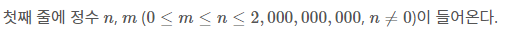 첫째 줄에 정수 $n$, $m$ ($0 \le m \le n \le 2,000,000,000$, $n \ne 0$)이 들어온다.