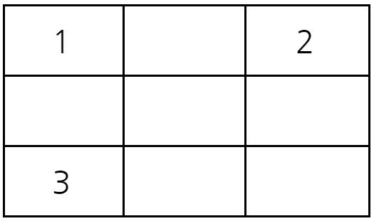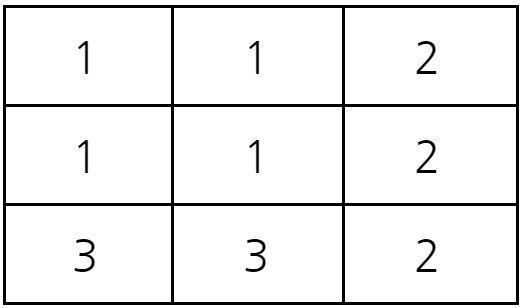 예를 들어 다음과 같이 3x3 크기의 시험관이 있다고 하자. 서로 다른 1번, 2번, 3번 바이러스가 각각 (1,1), (1,3), (3,1)에 위치해 있다. 이 때 2초가 지난 뒤에 (3,2)에 존재하는 바이러스의 종류를 계산해보자.