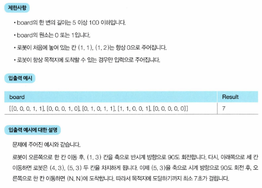 전형적인 bfs 문제이다. 다만 로봇의 크기가 두 칸이기 때문에 배열을 탐색하면서 두 칸의 좌표를 체크해야 하고, 상하좌우 90도씩 회전이 가능하다는 점에 유의해야 한다. 또한 방문 여부를 체크하기 위해 visited란 배열을 선언하고, 왼쪽 및 오른쪽 좌표를 문자열로 만든 값을 활용한다는 것도 유의점이다. 상하좌우로 회전을 할 수 있는지 여부를 체크할 때 로봇 기준 두 칸의 상하좌우 요소가 0인지 확인하는 작업이 필요하다.