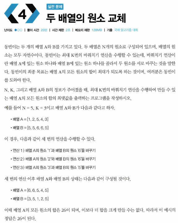 문제 풀이의 기본 아이디어는 주어진 두 배열을 k번만큼 반복문으로 탐색하며 각각 최솟값과 최댓값을 뽑아 치환하고, 배열의 요소 총합을 구하는 것이다. 우선 주어진 두 배열을 각각 arr1, arr2라고 하자. 그런 다음 arr1을 오름차순, arr2를 내림차순으로 정렬한다. for문을 k번만큼 순회시키면서 각각의 인덱스에 해당하는 값을 치환하고, arr1의 총합을 반환하면 정답이다.