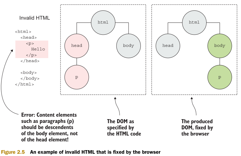 HTML과 DOM의 관계는 밀접하지만 같지는 않다. HTML은 DOM 구조를 만들기 위한 일종의 청사진(blueprint)인데, 브라우저는 이 청사진에 오류가 있을 시 자동으로 이를 수정하여 DOM 구조를 생성한다.