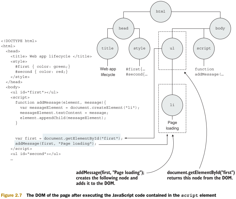 Figure 2.7의 <script> elemenet 내 JavaScript code가 실행되면 새로운 <li> element를 생성하고, 생성된 <li> element의 text를 수정한 다음 DOM 구조에 수정된 <li> element를 삽입한다. 하지만 아직 생성되지 않은 element에 대한 작업은 할 수 없다. 예를 들어 ID가 'second'인 <ul> element는 선택도 수정도 불가능하다. 왜냐하면 현재 <script> node보다 뒤에 있어서 아직 이르지 못했기 때문이다. 이 때문에 사람들은 <script> node를 HTML code의 맨 마지막 줄에 입력한다.