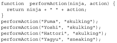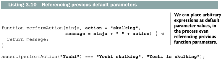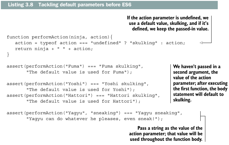 위처럼 action parameter의 기본값을 'skulking'이라고 설정해놓으면 performAction function 호출 시 따로 argument를 전달하지 않더라도 출력 시 'skulking'이 붙어서 나오고, 두 번째 argument로 다른 값을 입력하면 별도로 입력한 값이 action parameter에 할당되어 그 값이 출력된다.