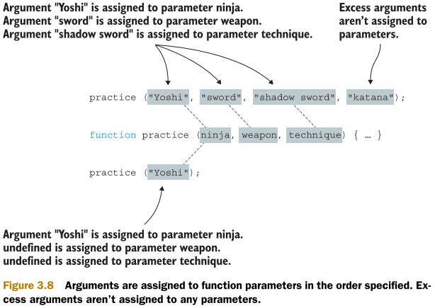 argument가 함수의 한 부분으로서 여러 개 열거될 때 이 argument들은 정의된 함수의 parameter에 왼쪽부터 오른쪽까지 순서대로 할당된다. 이때 argument와 parameter의 수가 같지 않아도 전혀 문제 되지 않는다. parameter의 개수를 초과하는 argument는 할당되지 않기 때문이다. 반면 parameter의 개수가 argument의 개수보다 많을 경우 argument를 받지 못한 parameter는 undefined를 반환한다.
