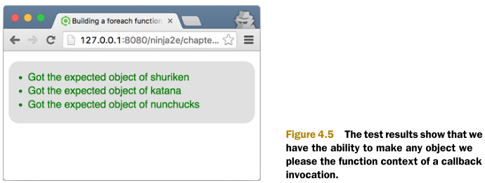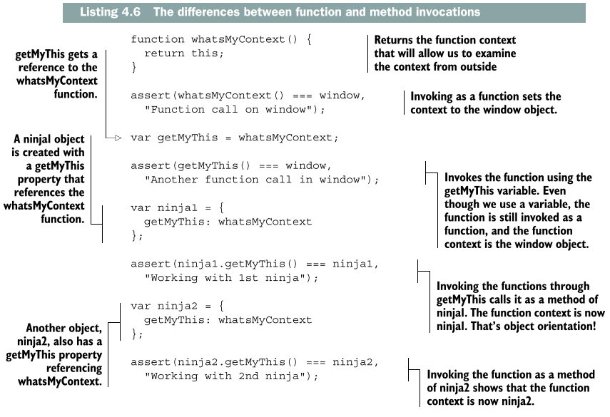 다음으로 조금 복잡한 object를 ninja1이라는 변수에다 whatsMyContext function에 대한 참조를 받는 getMyThis라는 property와 함께 정의한다. 이렇게 함으로써 object에 getMyThis라는 method를 생성하였다. whatsMyContext는 ninja1의 method가 아니다. whatsMyContext function은 여러 방법으로 호출되는 독립된 function이기 때문이다. 앞서 언급했듯 function을 method reference를 통해 호출할 때 function context는 해당 method의 object가 된다. (예제 코드의 경우 ninja1) function을 method로 호출하는 것은 JavaScript에서 객체 지향 문법을 구사할 때 핵심적인 개념이다. method로 function을 호출함으로써 method가 갖고 있는 object를 참조하기 위해 어떤 method 내에서든 this를 사용할 수 있게 된다.