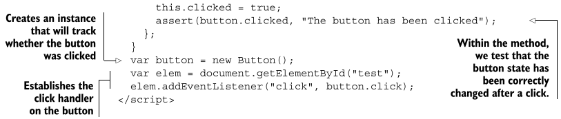 위의 button object에서는 button이 클릭될 때 발생되는 event handler로 기능하는 click method를 정의한다. 해당 method의 clicked 값은 'true'로 설정한다. 즉 button이 클릭되면 click method가 발동되어 clicked property를 'true'로 바꾸는 구조이다.