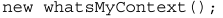 위 예제 코드에서 whatsMyContext function은 this로써 function context를 반환하여 사용자가 해당 function의 context가 무엇인지 알 수 있게 해준다. function의 이름으로 function을 바로 호출했을 때는 function을 function으로서 호출한 것으로 nonstrict mode 하에서 function context는 global context(window)가 된다. 그리고 getMythis라는 변수에 whatsMyContext function에 대한 참조를 생성한다. 이것은 function의 두 번째 instance를 생성하지 않고 같은 function에 대한 참조만을 생성한다.