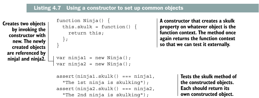 허나 이 같은 방식에도 제약은 있다. 무엇보다 두 가지 ninja object를 만들 때, 각자의 method로 쓰이는 같은 function을 공유할 수 있지만, 각각 object와 그 method를 설정하기 위해 유사하게 반복되는 코드를 사용해야 한다. 이 같은 문제를 앞으로 살펴볼 constructor를 통해 해결할 수 있다.