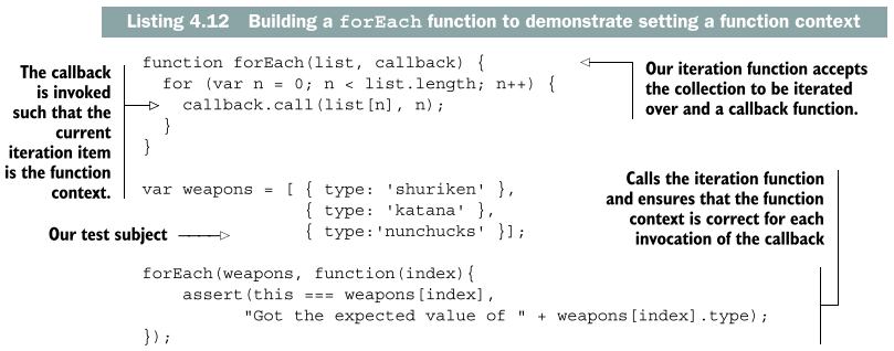 functional style을 보다 효과적으로 만들기 위해 모든 array object는 array 안의 각 요소를 콜백하는 forEach function에 접근할 수 있어야 한다. 이 같은 반복 function은 현재 요소를 parameter로서 콜백에 전달 가능하다. 하지만 대부분은 현재 요소를 콜백의 function context로 만든다.