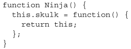 skulk method는 앞에서 살펴봤던 whatsMyContext function과 똑같은 기능을 수행하여 function context를 반환한다. constructor를 정의함과 함께 constructor를 두 차례 호출함으로써 새로운 Ninja object를 두 개 생성한다. 호출을 하여 반환된 값들은 새롭게 생성된 Ninja object에 대한 참조가 되는 변수에 저장된다.