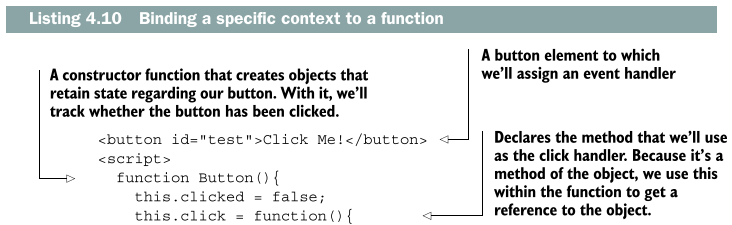 앞선 내용을 떠올려보자. 우리가 fucntion을 button.click()을 통해 호출한다면 context는 button이 될 것이다. 왜냐하면 function은 button object의 method로써 호출되었기 때문이다. 그러나 이 예제에서 브라우저의 event-handling 시스템은 호출의 context를 event의 target element로 정의하여 context가 button object가 아닌 button element가 되도록 한다. 즉 click 상태를 잘못된 object에다 설정한 것이다.