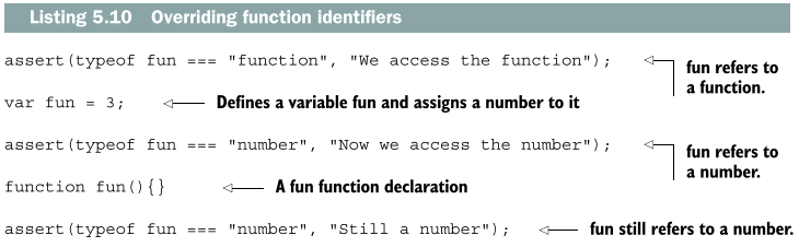 위 예제 코드에서 식별자 fun은 함수 선언이 등록될 때 두 번째 단계에서 마주치기 때문에 undefined 값이 변수 fun에 할당되지 않는다. 따라서 fun이 함수인지 확인하는 첫 번째 assert가 통과되는 것이다. 그러고 나서 식별자 fun에 숫자 3을 할당한다. 이렇게 함으로써 함수에 대한 참조를 잃고 식별자 fun은 숫자를 참조하게 된다.
