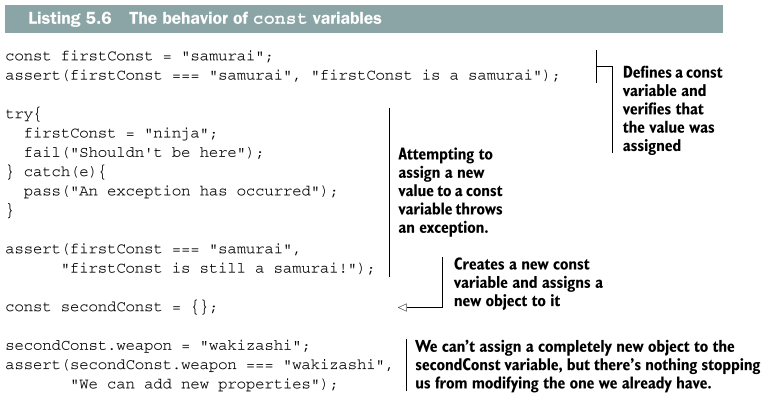 firstConst는 말 그대로 '항수(恒數)'이므로 새로운 값을 할당할 수 없다. 따라서 위 코드를 실행하면 JavaScript 엔진은 firstConst의 값을 'samurai'에서 'ninja'로 수정하지 않고 에러를 출력하게 되는 것이다.