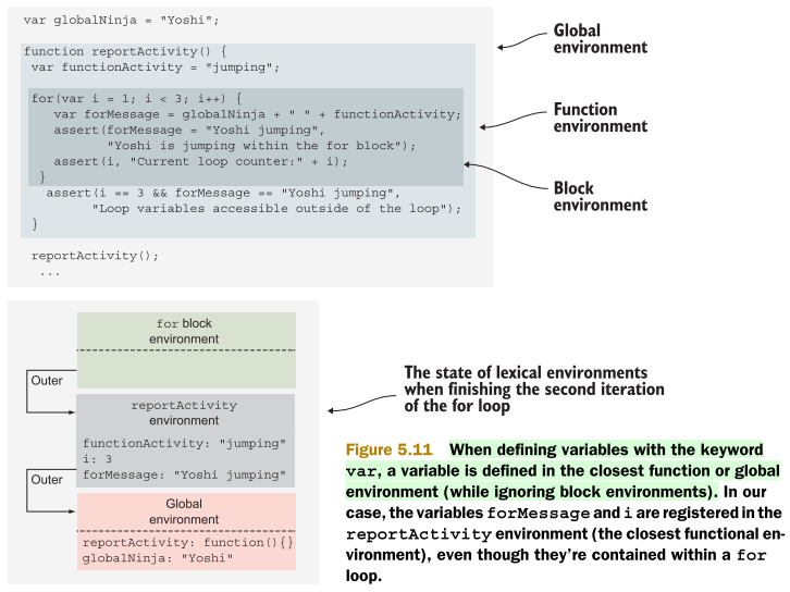 이는 var로써 정의된 변수는 블록에 상관 없이 가장 가까운 함수나 전역 렉시컬 환경에 등록된다는 사실에서 비롯된다. 아래 예제는 reportActivity 함수 내에서 for 반복문이 두 바퀴를 돌고 난 다음의 상태를 나타낸다.