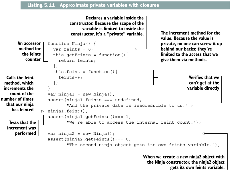 Ninja 생성자와 함께 만들어지는 모든 객체는 생성자가 호출될 때 정의되는 변수 주변을 닫는 자신만의 고유 메소드를 가진다.(ninja1.getFeints 메소드는 ninja2.getFeints 메소드와 다르다) 이러한 '프라이빗' 변수들은 직접적으로는 접근 불가능하고 생성자 안에서 만들어지는 객체 메소드를 통해서만 접근 가능하다.