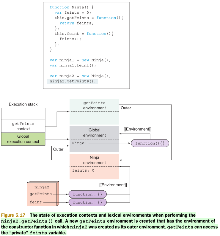 추가로 함수가 만들어질 때마다 생성된 렉시컬 환경을 유지한다.(내부 [[Environment]] 프로퍼티를 통해서) 위 예제의 경우, Ninja 생성자 함수 안에서 getFeints와 Feint라는 Ninja 환경에 대한 참조를 얻는 두 가지 함수를 만든다. Ninja 환경은 두 함수가 생성된 환경이다.