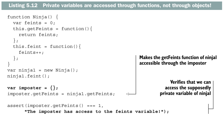 위 예제 코드는 ninja1.getFeints 메소드를 완전히 새로운 imposter 객체에 할당하는 소스 코드이다. getFeints 함수를 imposter 객체에서 호출할 때마다 ninja1이 인스턴스화될 때 만들어진 변수 feints의 값에 접근할 수 있는지 시험하고 전체 프라이빗 변수를 속이고 있음을 증명한다.