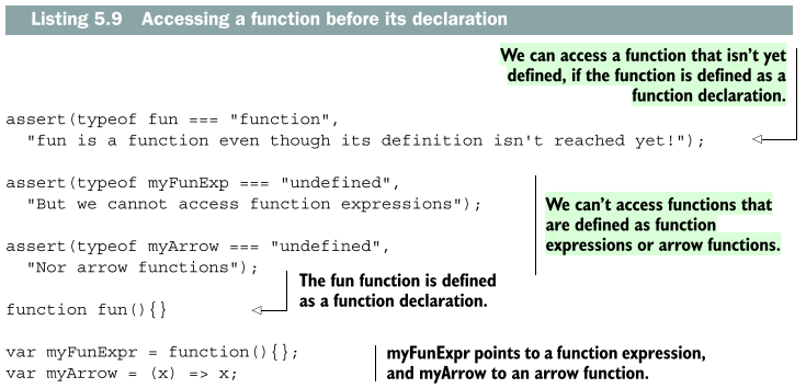 함수 표현(function expressions)와 화살표 함수(arrow funtionos)는 이 처리 과정에 포함되지 않으며 이 둘은 정의한 위치에 프로그램이 이르면 그때서야 실행된다.