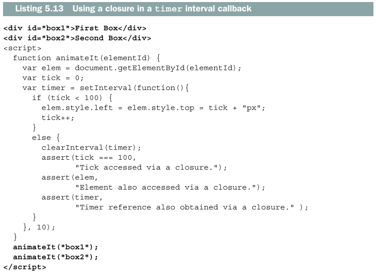 animateIt 함수를 호출할 때마다 해당 애니메이션의 중요한 변수 집합(elem, tick, timer)을 추적하는 새로운 함수 렉시컬 환경이 만들어진다. 클로저를 통해 해당 함수의 변수와 함께 적어도 함수 하나가 작동하고 있다면 해당 환경은 활성화 상태를 유지한다. 위 예제의 경우, clearInterval 함수가 호출될 때까지 브라우저는 setInterval 콜백의 활성화를 유지한다. 나중에 인터벌이 끝나고 나면 브라우저는 일치하는 콜백을 부름과 함께 클로저를 통해 콜백이 생성될 때 정의된 변수들이 따라온다. 이는 임의로 콜백을 맵핑하고 변수들을 활성화하는 문제를 회피하게 해주며 따라서 코드 작성을 매우 간결하게 해준다.