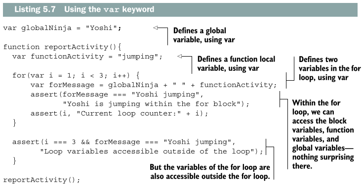 위 예제에서 보듯 for 반복문의 내용 안에서 블록 변수(i와 forMessage), 함수 변수(functionActivity), 전역 변수(globalNinja)에 아무 제약 없이 접근 가능하다.