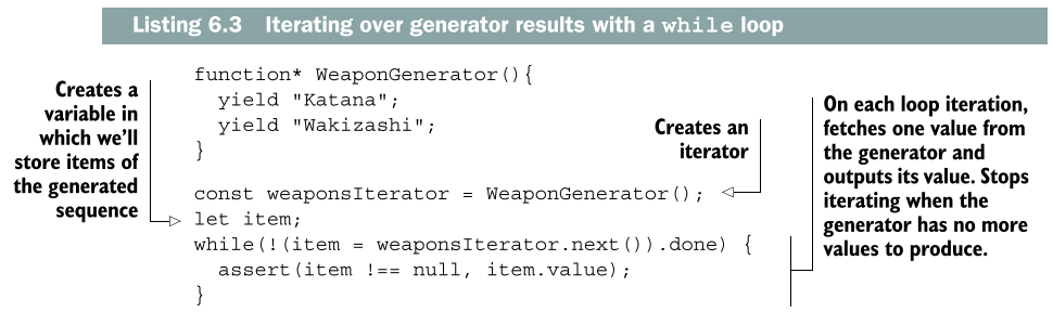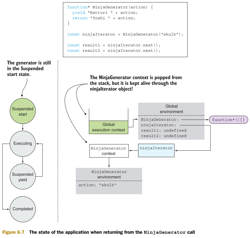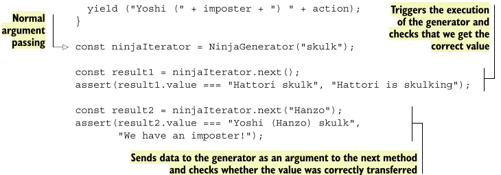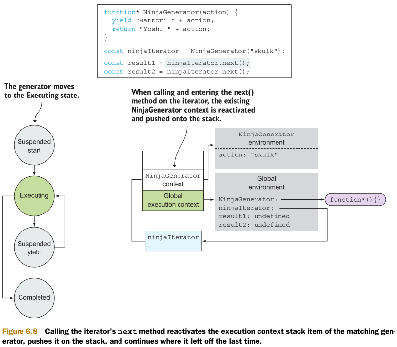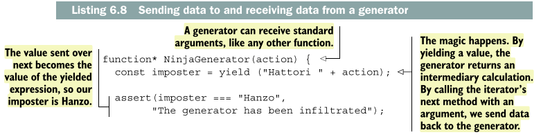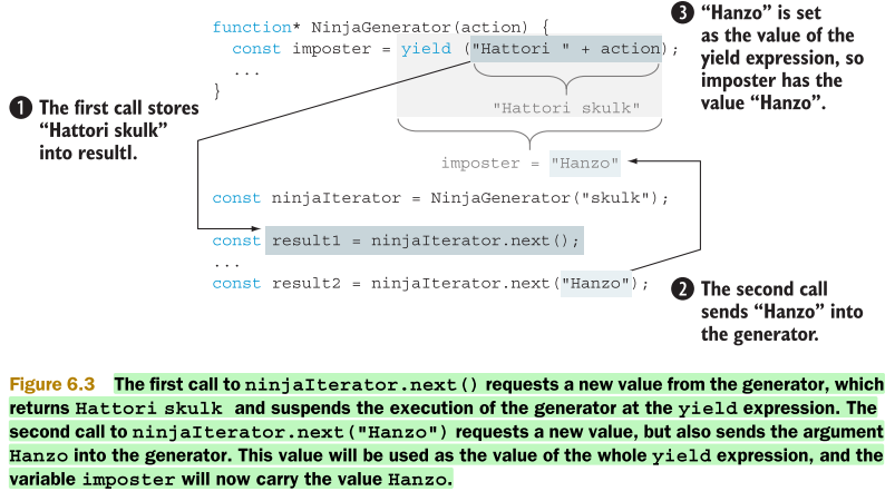 위 예제에는 ninjaIterator의 next 메소드에 대한 호출이 두 개 있다. 첫 번째 호출은 제너레이터에서 첫 번째 값을 요청한다. 제너레이터는 아직 실행되지 않은 상태여서 이 호출로써 제너레이터가 실행되고 'Hattori' + action 표현식을 계산하여 Hattori skulk라는 값을 생성한 다음 제너레이터의 실행을 중단한다. 여기까지는 별반 특별한 점이 없다.