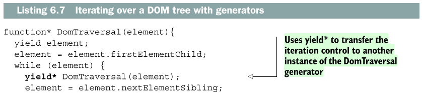 위 예제는 제너레이터를 사용하여 DOM 구조의 하위 요소들을 탐색할 수 있음을 보여준다. 앞서 재귀 함수를 활용한 코드와 기능적으로는 똑같지만 사용하기 복잡한 콜백 구문을 쓰지 않고 비교적 단순한 for-of 반복문을 통해 모든 하위 요소들을 출력할 수 있다는 장점이 있다.