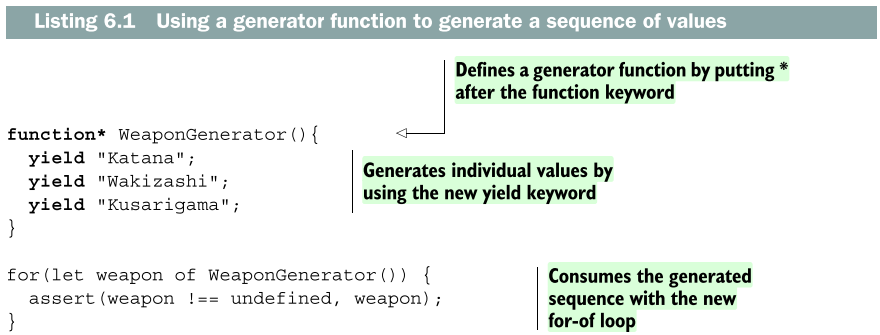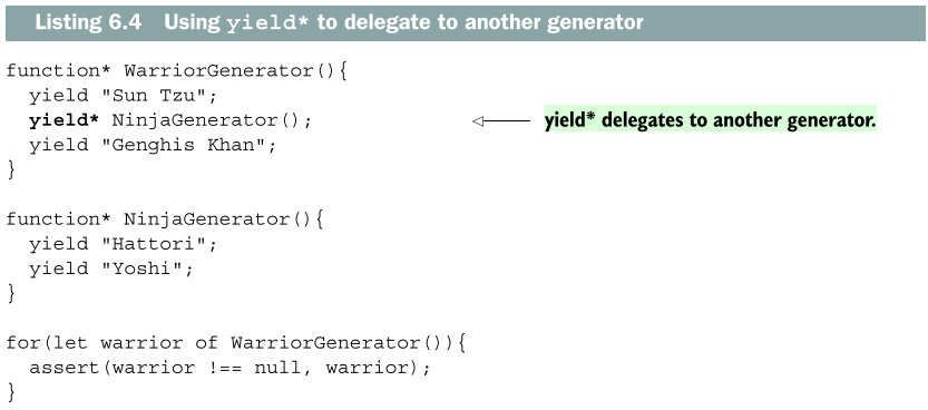 이 코드를 실행하면 인출값으로 'Sun Tzu', 'Hattori', 'Yoshi', 'Genghis Khan'을 보게 될 것이다. yield* 연산자를 사용함으로써 다른 제너레이터를 넘겨줄 수 있다. 여기서 'Hattori'와 'Yoshi'는 yield* 연산자로 양도된 NinjaGenerator에서 생성된 값이다.