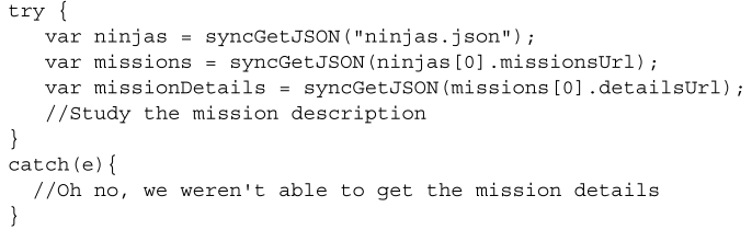 상상을 하나 해보자. 우리는 freelanceninja.com의 개발자로 일하고 있다. 이 사이트는 고객들에게 비밀 임무를 수행하는 닌자를 고용하는 데 도움을 주는 사이트이다. 우리의 과업은 고객들로 하여금 가장 인기 있는 닌자가 수행한 최고 등급 임무에 대한 세부 정보를 얻게 하는 기능을 구현하는 것이다. 닌자를 나타내는 자료, 임무에 대한 요약, 임무에 대한 세부 사항 등이 원격 서버에 저장되어 JSON 형식으로 인코딩된다. 이 작업을 코드로 작성하면 아래와 같다.