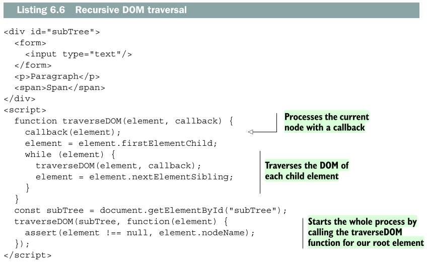 웹 페이지의 레이아웃은 DOM에 기초한다. DOM은 나무 형상 같은 HTML의 노드(node) 구조로 뿌리 노드를 제외한 모든 노드는 오직 하나의 부모 노드만을 갖고 0개 혹은 그 이상의 자식 노드를 갖는다. DOM은 웹 개발의 근본적인 구조이기 때문에 많은 코드들이 DOM을 순회하는 것을 기반으로 한다. 이 같은 순회 작업을 수행하는 비교적 간단한 예는 바로 재귀 함수(recursive function)를 사용하는 것이다.