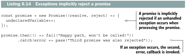 프로미스 실행자의 내용을 보면 정의되지 않은 undeclaredVariable을 증가시키려고 한다. 예상하는 대로 이 프로미스의 결과는 예외이다. 왜냐하면 위 코드 어디에도 try-catch문이 없어 현재 프로미스의 결과는 암묵적인 거절이 되고 catch 콜백이 호출된다. 이 같은 상황에서 then 메소드에다 두 번째 콜백을 쉽게 제공할 수 있고 최종 효과는 동일할 것이다.