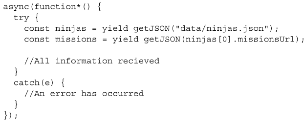 제너레이터 다음 줄에서 수신한 데이터 중 일부인 ninja[0].missionUrl을 사용하여 가장 유명한 닌자가 수행한 임무 목록을 포함해야 하는 다른 프로미스를 만드는 또 다른 getJSON 호출을 수행한다. 이는 비동기적 작업이어서 이 작업이 얼마나 걸릴지 모르므로 다시금 실행을 양보하고 전체 프로세스를 반복한다.