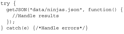 위 예제에는 오류가 잠재되어 있다. 서버와 클라이언트 간의 커뮤니케이션에서 발생하는 에러, 예상치 못한 데이터로 응답하는 서버(잘못된 응답 상태), 유효하지 않은 JSON 코드 등이다. 허나 getJSON 함수를 쓰는 코드 측면에서 보면 에러의 세세한 부분까지는 신경 쓰지 않아도 된다. 단지 데이터를 제대로 수신했을 때와 그러지 못 했을 때의 콜백만 제공하면 된다.