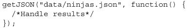 만약 모든 것이 계획대로 진행되어 성공적으로 객체를 얻었다면 프로미스가 무사히 해결된다. 마침내 서버로부터 ninjas를 받기 위해 getJSON 함수를 사용할 수 있는 것이다.