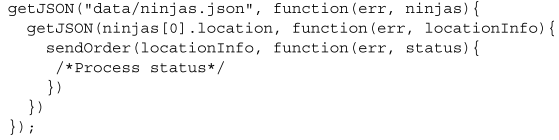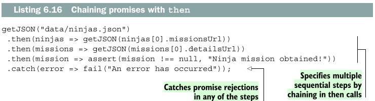 위 예제 코드는 계획대로 모든 것이 순조롭게 진행된다면 하나에 이어 또 하나가 해결되는 연속된 프로미스를 생성한다. 첫 번째로 getJSON("data/ninjas.json") 메소드를 사용하여 서버 상의 파일로부터 ninjas의 목록을 받아온다. 리스트를 받고 나서 첫 번째 닌자에 대한 정보를 취하고 getJSON(ninjas[0].missionsUrl) 메소드로써 닌자가 부여받은 임무의 목록을 요청한다. 이후 미션이 들어오면 첫 번째 임무에 대한 세부 사항을 getJSON(missions[0]/detailsUrl) 메소드로 요청한다. 이윽고 임무의 세부 사항이 기록에 남는다.