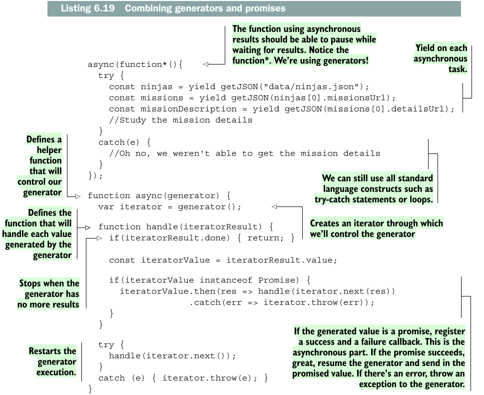 시간이 흐른 후 브라우저가 응답(긍정 혹은 부정)을 받을 때 프로미스 중 하나가 호출된다. 프로미스가 성공적으로 해결되면 성공 콜백이 호출되어 반복자의 next 메소드가 실행되어 제너레이터에 다른 값을 요청한다. 이는 중단되었던 제너레이터를 다시 가져와서 콜백에 의해 전달된 값을 제너레이터에 보낸다. 이것은 서보로부터 비동기적으로 가져온 ninjas 목록이 되는 값이 첫 번째 yield 표현식 이후 제너레이터의 본문을 다시 입력한다는 것을 의미한다. 제너레이터 함수의 실행은 계속되어 plan 변수에 값이 할당된다.
