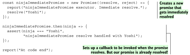 다음 작업으로 또 다른 프로미스인 ninjaImmediatePromise를 생성한다. 이 프로미스는 resolve 함수를 호출하여 생성되자마자 해결된다. 생성된 후 pending 상태에 들어가는 ninjaDelayedPromise와는 달리 ninjaImmediatePromise는 resolved 상태에 들어가며 해당 프로미스는 이미 'Yoshi'라는 값을 가진다.